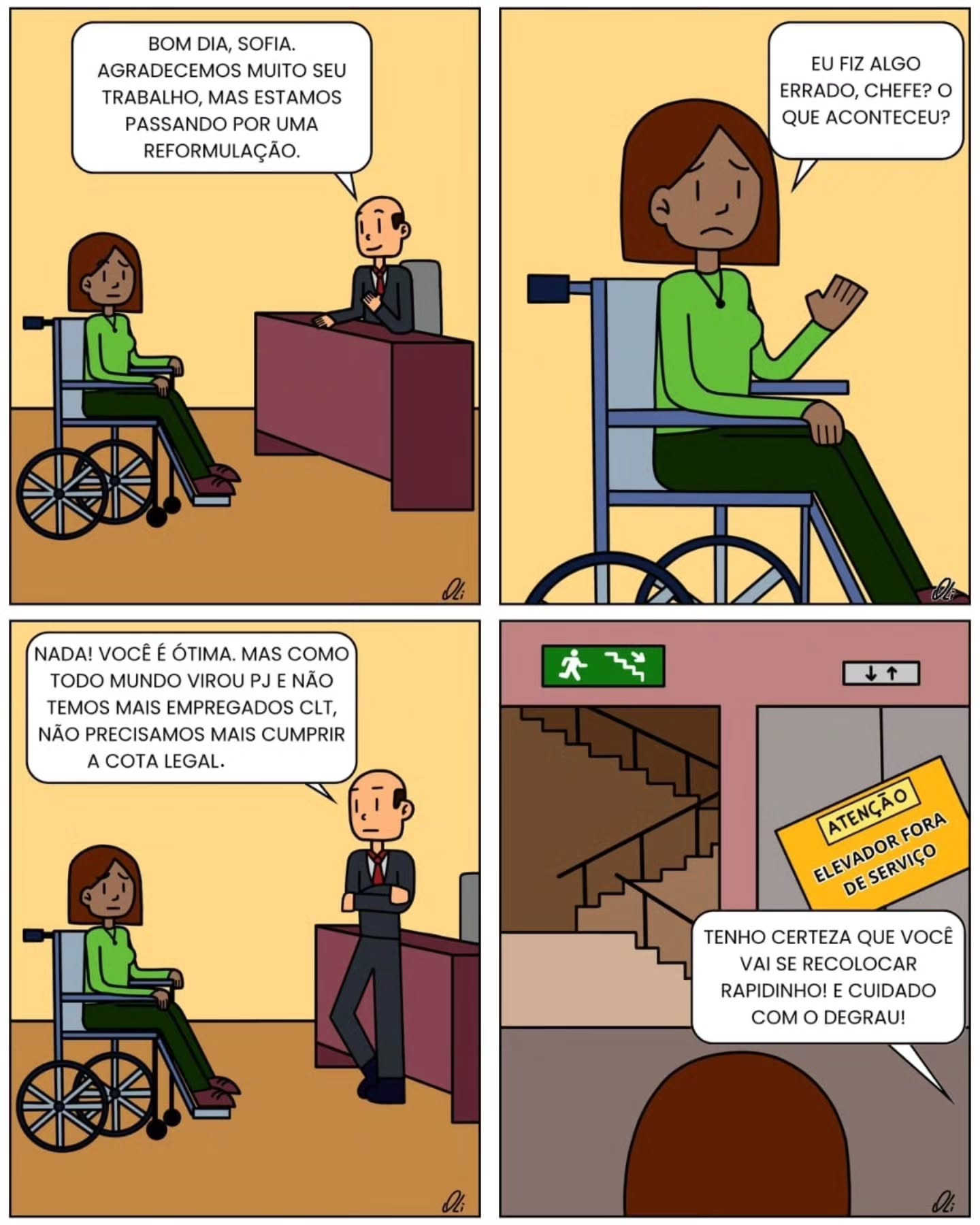 E quando a pejotização vira sinônimo de exclusão? Na nova história da série do MPT, vemos um dos efeitos mais graves da pejotização irrestrita: a dispensa de pessoas com deficiência pela simples razão de que a empresa deixou de ter empregados formais. Isso porque a cota legal para inclusão de pessoas com deficiência no mercado de trabalho — prevista na Lei nº 8.213/91 — só se aplica a empresas com mais de 100 empregados registrados pelo regime da CLT. Quando todos viram “PJ”, a empresa dribla a lei, elimina a obrigação e contribui com o aumento do desemprego entre pessoas com deficiência.